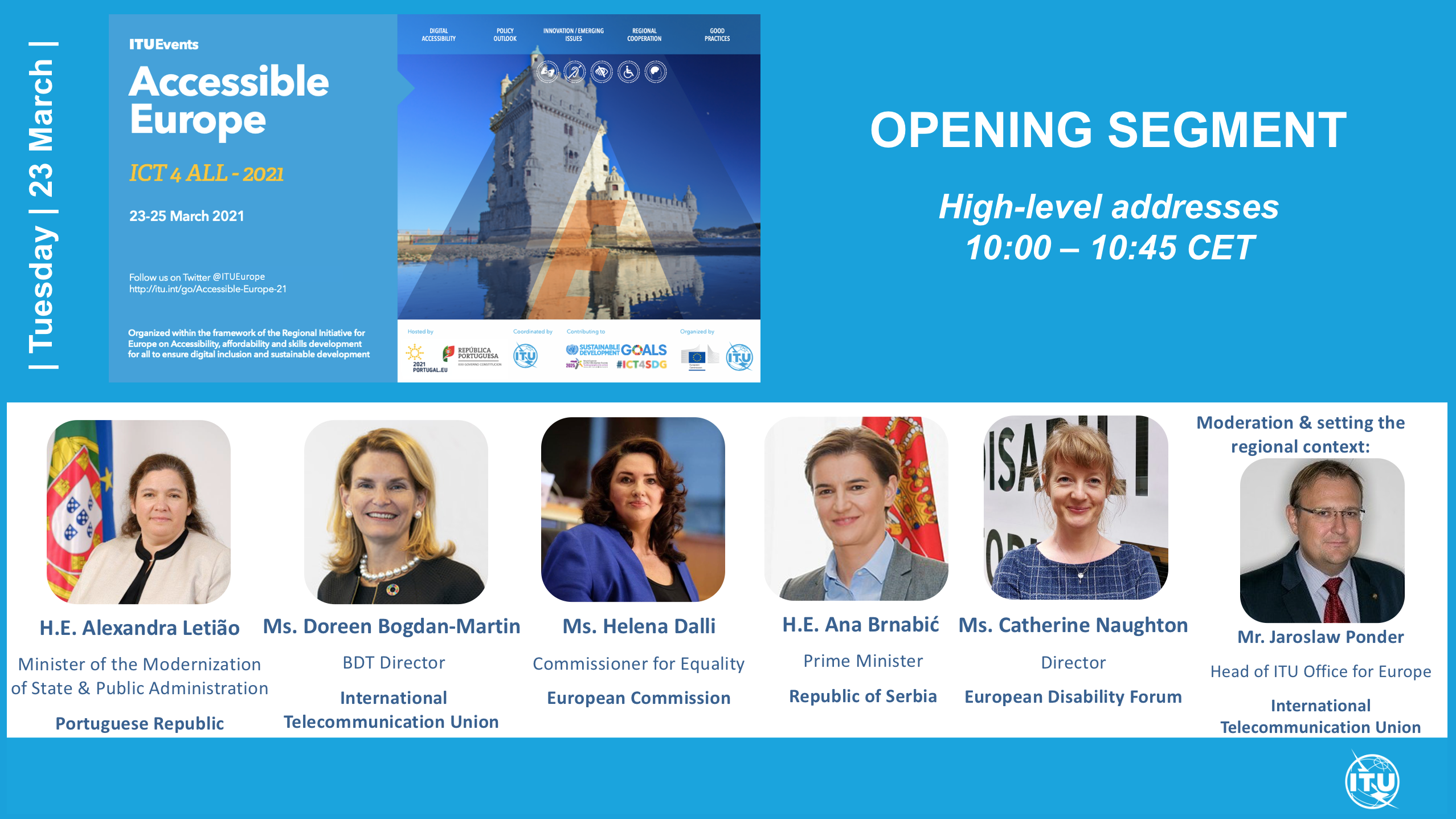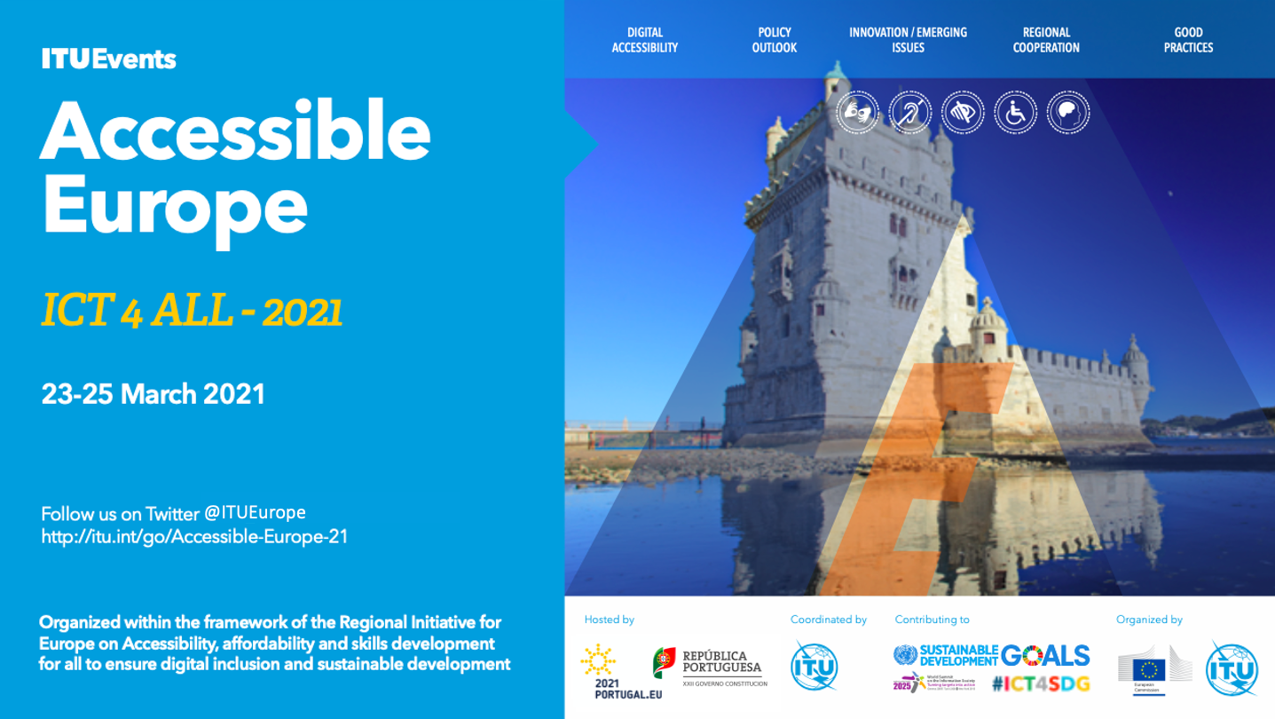 The Regional Forum for Europe on “Accessible Europe: ICTs 4 ALL" took place virtually from 23 to 25 March 2021. This regional event for Europe was jointly organised by the Telecommunication Development Bureau (BDT) of the International Telecommunication Union (ITU) and European Commission (EC). The organisation of this event was supported by the Government of Portugal and conducted as part of the Portuguese Presidency of the Council of the European Union.