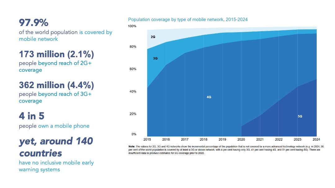 Despite widespread connectivity, critical gaps remain in reaching vulnerable populations during emergencies. The national coverage statistics tell us that 173 million people (ITU Facts and Figures 2024) live in places where they cannot receive early warning messages, but they cannot tell us specifically where these people are.