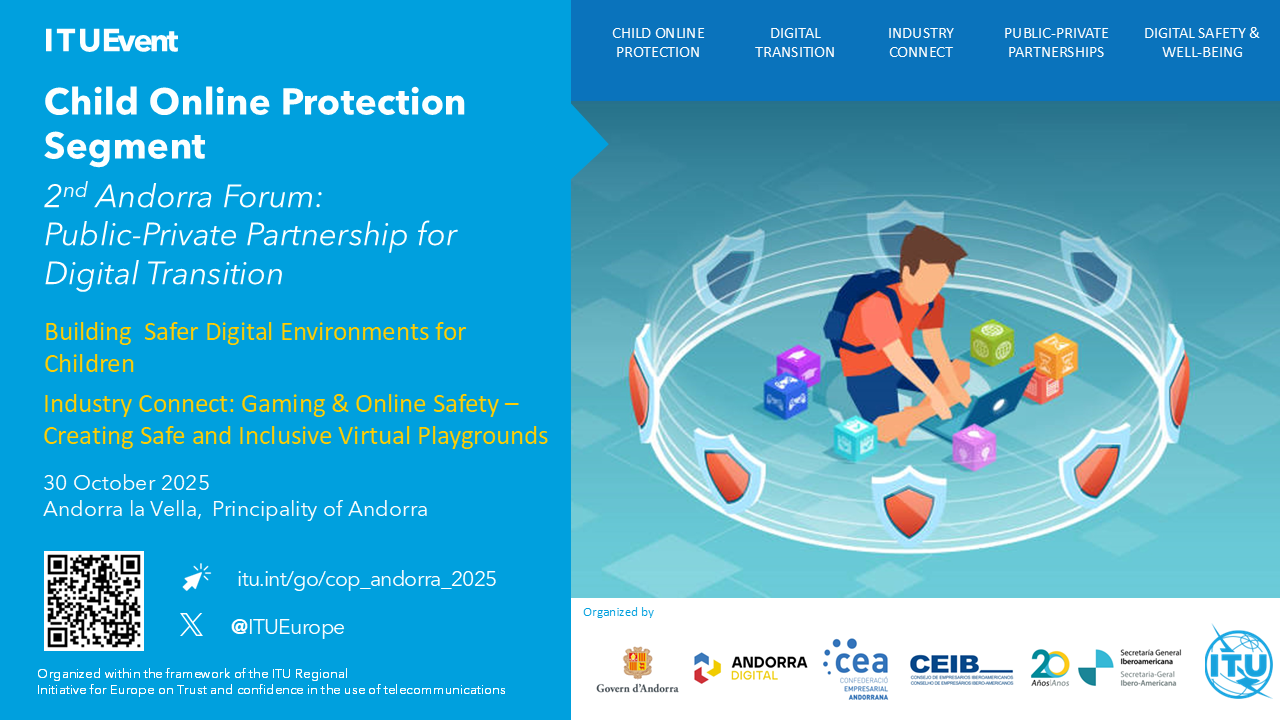 It is with great honour that the Telecommunication Development Bureau (BDT) is pleased to invite you to the Child Online Protection (COP) Segment taking place within the 2nd Andorra Forum: Public-Private Partnerships for Digital Transition, on 30 October 2025 in Andorra la Vella, Principality of Andorra.