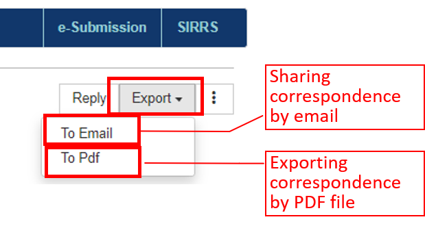 Each correspondence can be exported and downloaded as a PDF file by selecting “To PDF" under the top right "Export" button (Fig. 4). This PDF file can be saved or printed. The exported PDF file includes the abstract of the correspondence such as information of sent/received date, "From", "To", subject and the message without attachments.