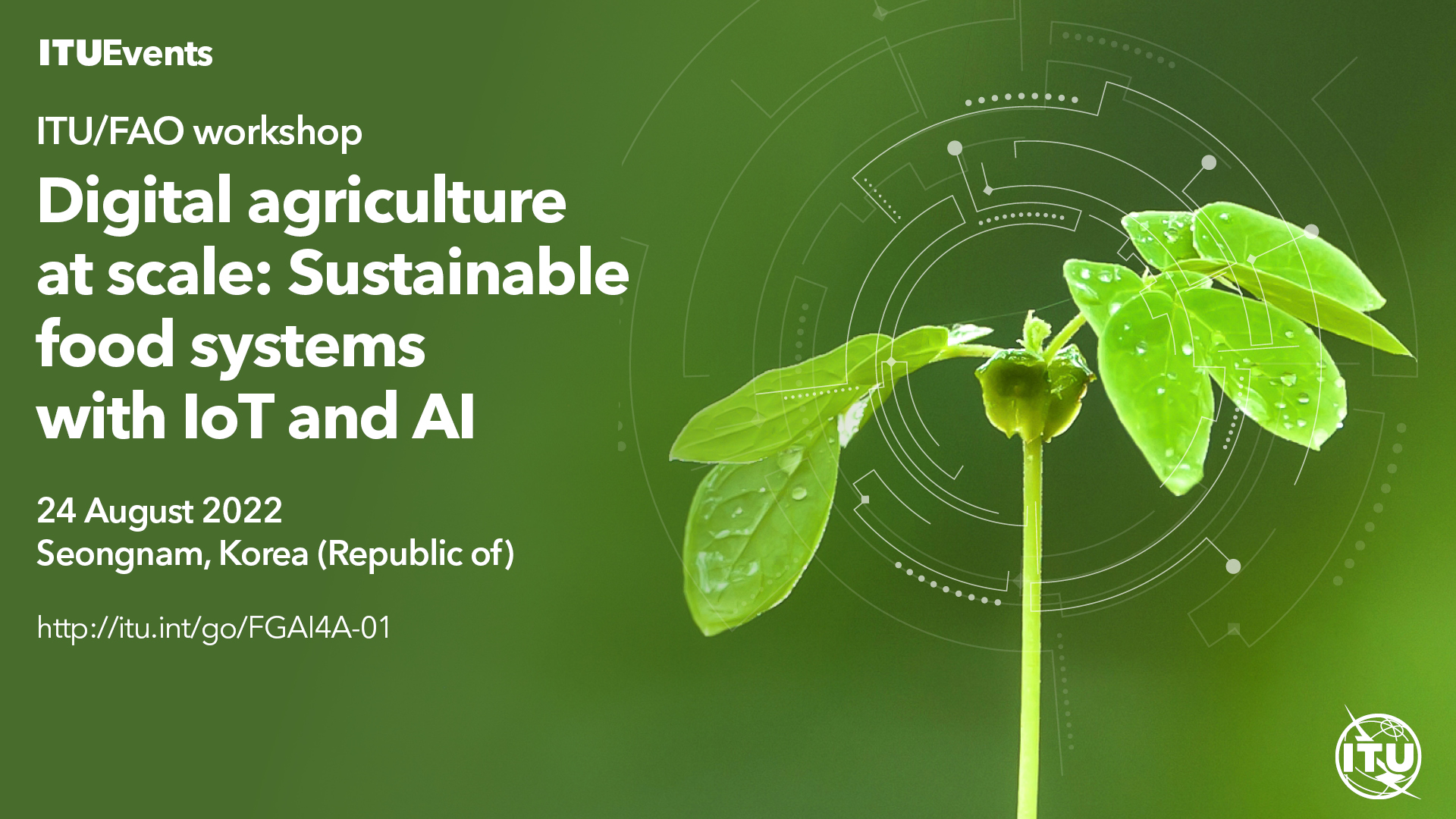 The International Telecommunication Union (ITU) in collaboration with the Food and Agriculture Organization (FAO) organized a workshop on “Digital Agriculture at Scale: Sustainable Food Systems with IoT and AI", that took place in Seongnam, Korea (Rep. of) on 24 August 2022 from 10h00 to 17h00 KST. The workshop was hosted by the National Radio Research Agency (RRA), Ministry of Science and ICT, Republic of Korea. The workshop was organised as a physical event with remote participation. The workshop was followed by the third meeting of the ITU-T Focus Group on "Artificial Intelligence (AI) and Internet of Things (IoT) for Digital Agriculture" (FG-AI4​A) taking place on 25 August 2022 at the same venue.
