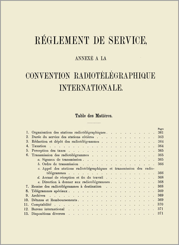 Fruto de la Conferencia de 1906 fue el Convenio Radiotelegráfico Internacional, cuyo Anexo contenía el primer reglamento sobre la materia. Este reglamento se fue ampliando y revisando en las numerosas conferencias posteriores, y acabo convirtiéndose en lo que conocemos como el
