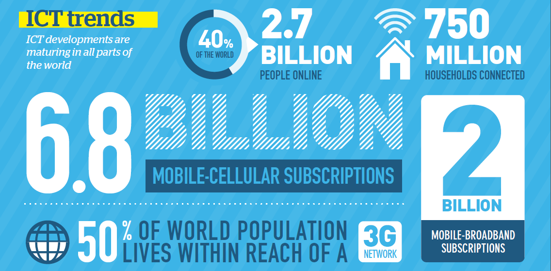 Selon les statistiques de l'UIT, on comptait 6,8 milliards d'abonnements de téléphonie mobile en 2013, soit presque autant d'abonnements que de personnes vivant dans le monde. Qui plus est, les personnes optent de plus en plus pour des smartphones et d'autres dispositifs mobiles qui leur permettent d'accéder à l'Internet.