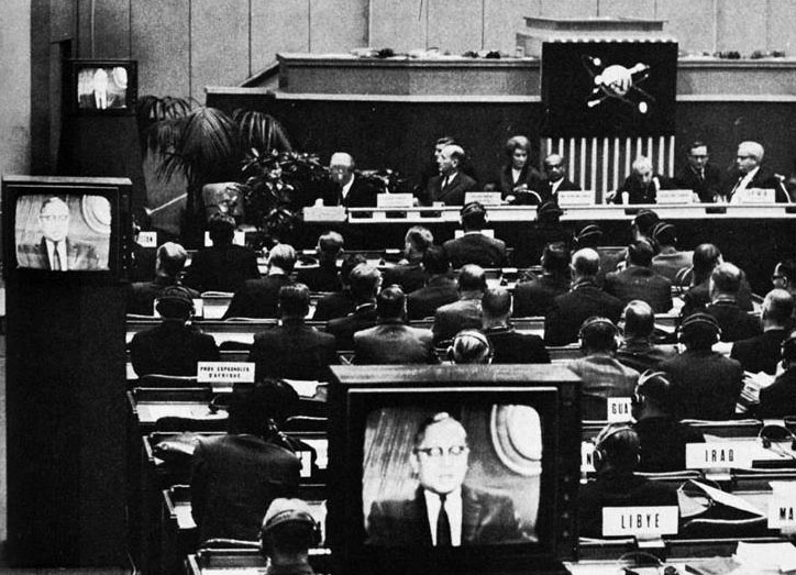|  Генеральный секретарь Организации Объединенных Наций У Тан выступает на проходящей в Женеве Конференции МСЭ по космической радиосвязи, находясь в Нью-Йорке, с использованием спутника Telstar (7 октября 1963 г.). Источник: МСЭ.